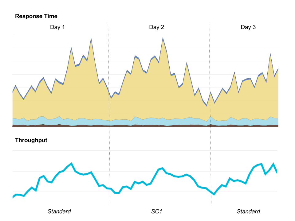 Here's a side-by-side comparison of the peformance distribution of the two different volume types serving a 24 hour sample of read/write queries that take Vertica a median time right at 1 second to serve on standard EBS:
