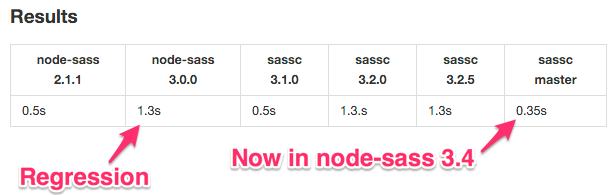 sassc is the command-line driver the libsass team uses to test libsass directly (since libsass is just a library). The above benchmarks were used to try and isolate if the performance regression was node-sass specific or if it was in libsass.