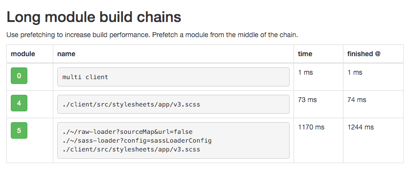 You'll get to see a cool dependency tree, and various benchmarks on how long each modules took to process. If you see a lot of time spent in your CSS or SASS, keep on reading.