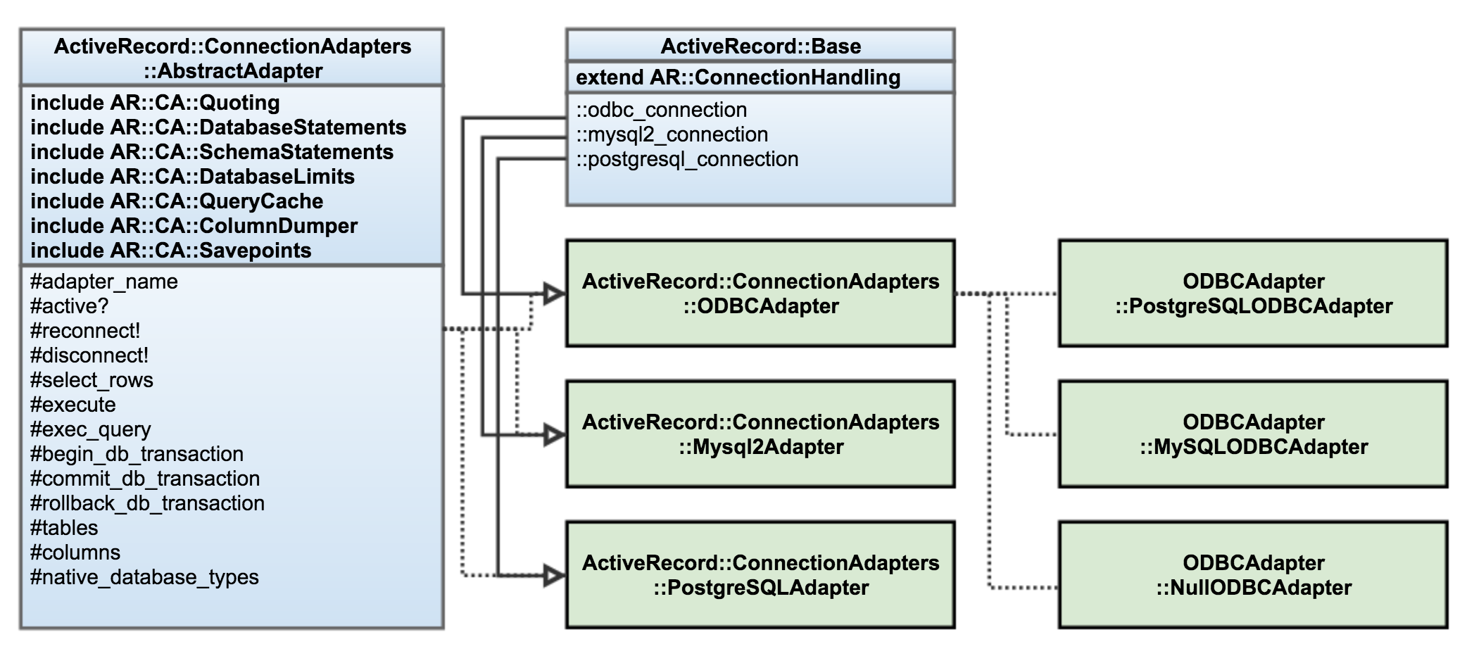 First, a few notes about the way ActiveRecord organizes its code. When a Rails application boots up, it establishes all of the necessary connections to various databases (in the default use case, just the one) through the ActiveRecord::Base::establish_connection method. This method calls out to ActiveRecord::Base::*_connection, where the * is whatever value you specify for the adapter key inside your database.yml. This function is responsible for creating a new adapter object (a subclass of ActiveRecord::ConnectionAdapters::AbstractAdapter), which is then returned and used as the active connection. The subclasses implement the behavior necessary for the individual DBMS to fulfill the correct interface.