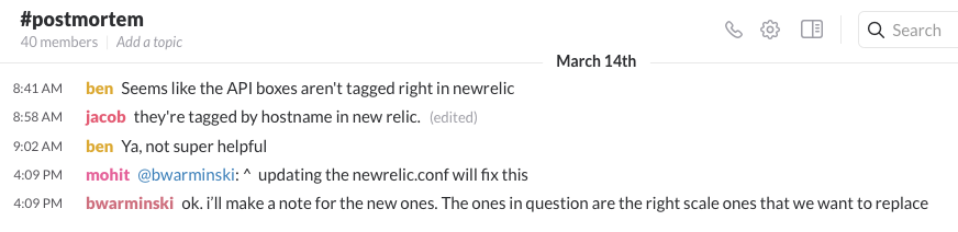 After the initial crisis is over, our engineers move into the #postmortem Slack channel.