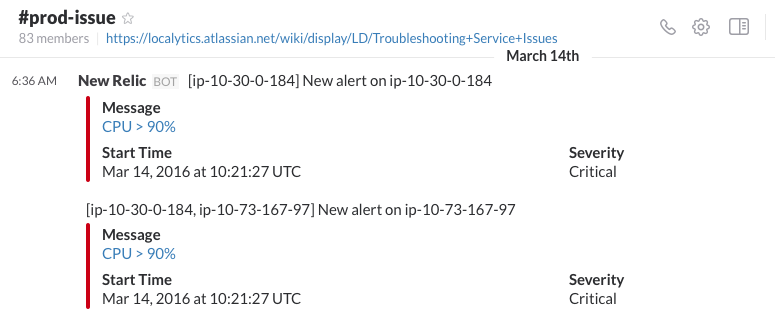 Pingdom, New Relic, AWS Cloudwatch, and coded circuit breaker patterns post to a #prod-issue channel in Slack. All of those systems separately notify the team through PagerDuty integration. An engineer's first response to receiving a PagerDuty is to open Slack and check #prod-issue for more details, rapidly speeding up triaging the issue. While you might get a page about a particular service being down, checking #prod-issue lets you see if there are, for example, larger service problems before digging any further.